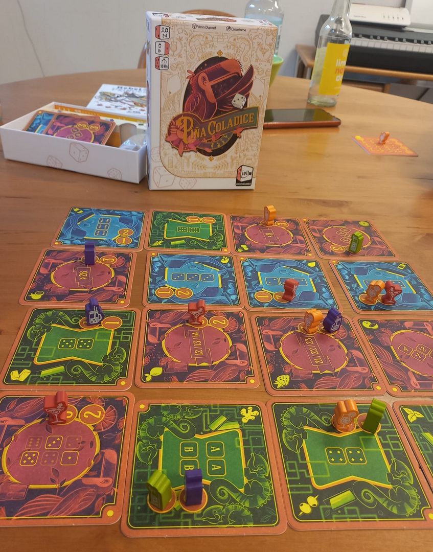 Piña Coladice bringt schnellen Partyspaß an den Tisch. Wir würfeln, sammeln Kombinationen auf unseren Untersetzern und versuchen, vier Cocktailgläser in einer Reihe auszulegen, um zu gewinnen. Es ist ein kurzweiliges, fröhliches Spiel, bei dem jeder mitfiebert – perfekt für die ganze Runde.